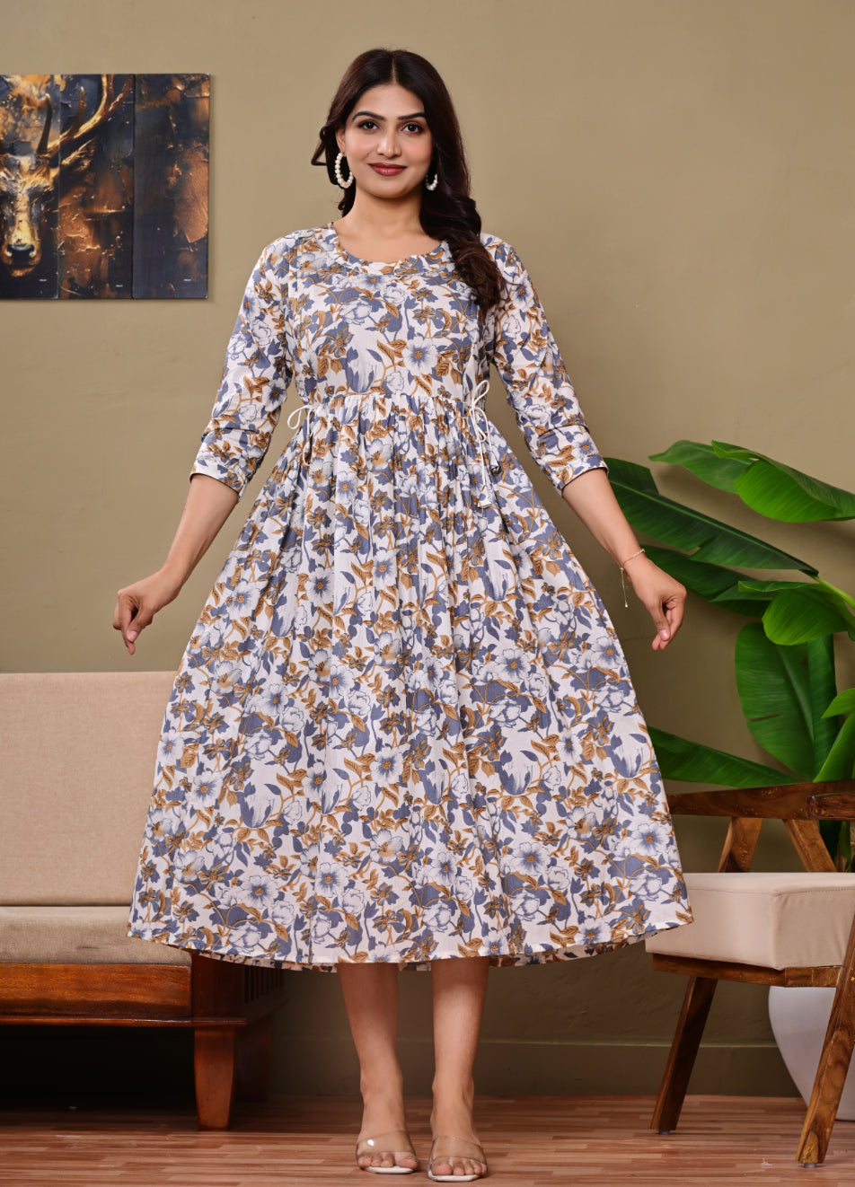 White Floral Printed A-Line Maternity Dress with Tie-Up Waist